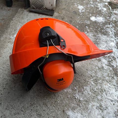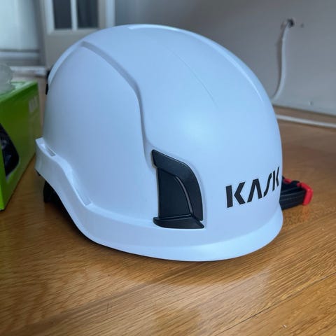 Vit hjälm med invändigt justerbart spännsystem och hakband. Hjälmen har hårt ytterskal och inre fästen för att sitta stadigt på huvudet. Passar för användning där huvudskydd behövs, exempelvis vid arbete eller fritidsaktiviteter som kräver hjälm.