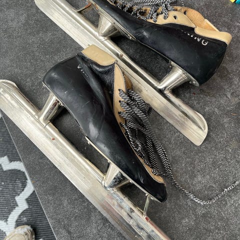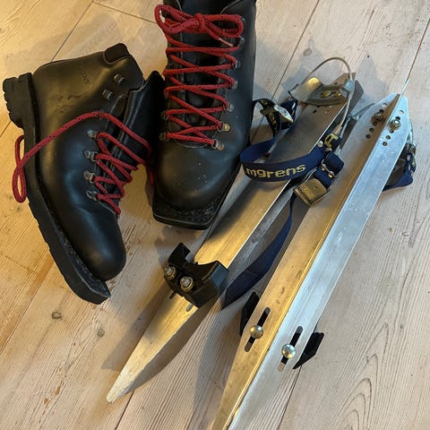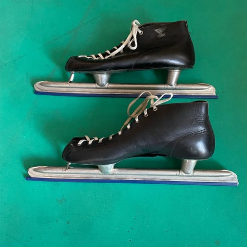 Skridskor övriga modell i storlek 42. Svarta läderliknande kängor med röda snören och remmar över vristen. Långa metallskenor som passar för allmän åkning på is, exempelvis naturis eller isbana. Passar vuxen med skostorlek 42. Almgrens helt nya oanvända