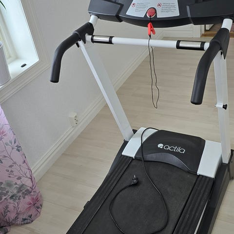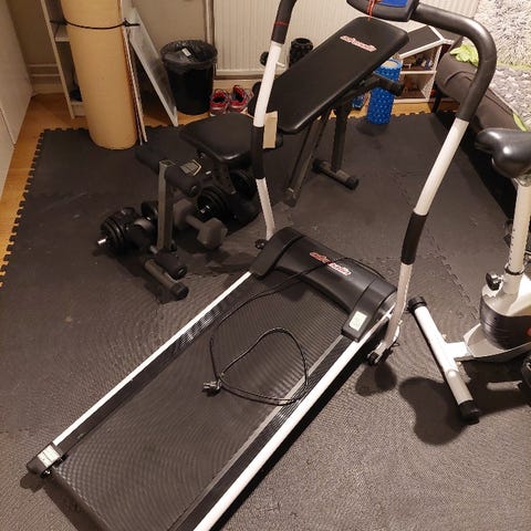 En löpband som funkar smidigt. Passar vem som helst. Kan justera snabbheten från 1 till 16. Den är 162 cm lång.