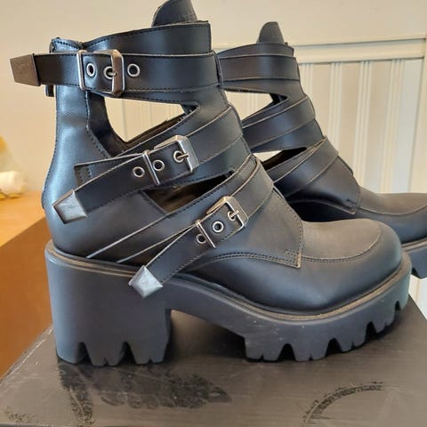 EYTYS stövlar i storlek 40. Kraftig yttersula med grovt mönster och markerad klack. Svart färg med sliten/washed effekt. Stövlarna har flera remmar med metallspännen runt skaftet och foten.