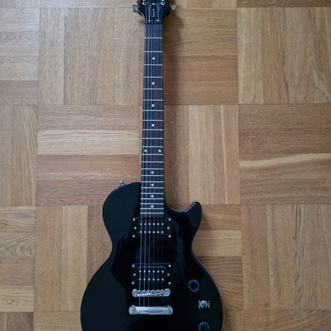 Epiphone Les Paul Studio i sliten körsbärsfinish. Klassisk solid kropp med två humbucker-pickuper, treläges pickup-väljare och separata kontroller för volym och ton. Utrustad med fast stall och svajfri konstruktion för stabil stämning. Lämplig för elgitarrspel i rock, pop och blues, till exempel. Gitarren är i utmärkt skick med nyservice och nya strängar.