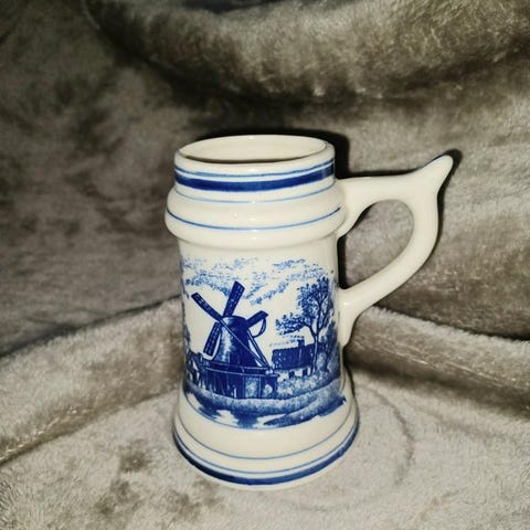 Höhr Grenzhausen ölsejdel i keramik. Sejdeln är huvudsakligen beige med dekorerat motiv i blått och brunt runt om. Undersidan är märkt med modellnummer och tillverkningsstämpel. Passar för servering av öl eller andra drycker samt som prydnadsföremål.