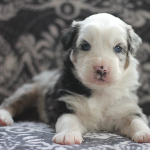 Han är svart & tan/merle med ett blått och ett brunt öga. En otroligt gullig och mysig valp som är minsta killen i kullen och redan nu visar en fin personlighet.