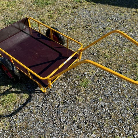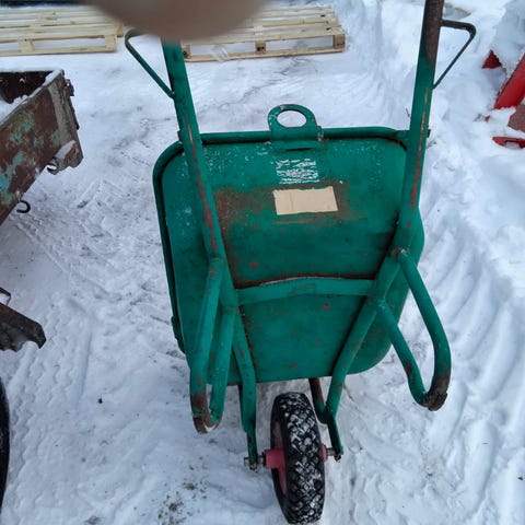Skanska byggvagn på hjul i blå färg. Vagnen har två större luftgummihjul samt två svängbara länkhjul för förflyttning. Lämplig för transport och förvaring av material på byggarbetsplats eller i verkstad. Utrustad med rektangulär behållare med höga sidor.