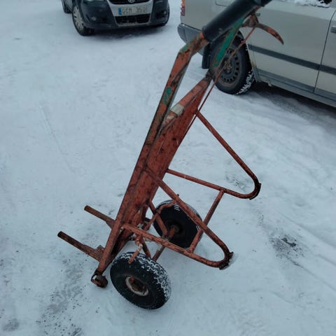 Skanska byggvagn blå på hjul,,med bromsar