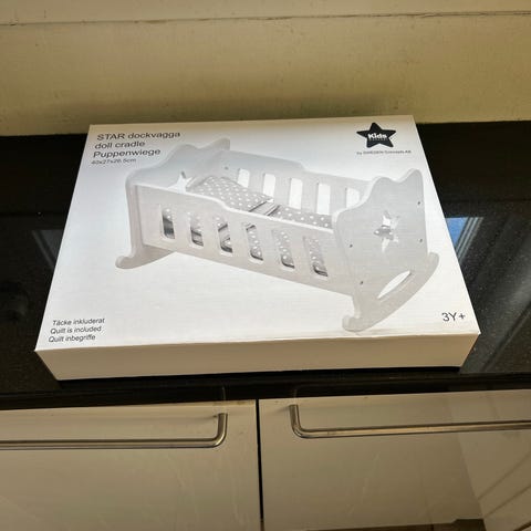 Dockvagga i vitmålat trä. Klassisk modell med gungfunktion och utskurna öppningar i gavlarna. Passar för dockor och gosedjur i mindre storlek. Lämplig som leksak i barnrum eller lekhörna.
