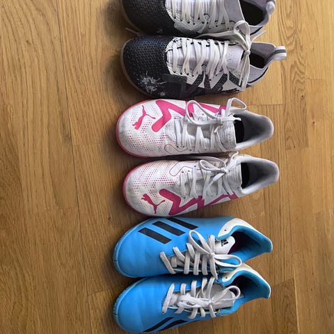 Adidas fotbollsskor för inomhusbruk. Båda paren har snörning och låg profil med platt sula anpassad för spel på inomhusunderlag. Passar för fotboll eller futsal inomhus. Även andra sporter så klart.