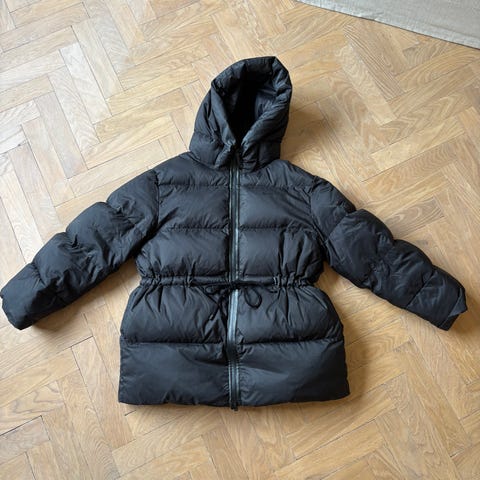 Svart vinterjacka med huva, fickor fram, dragkedja och knappar framtill.
