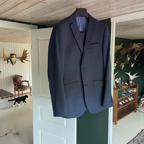 En mycket fin kostym av märket Riley använd endast en gång på examen. Inköpt på Brothers och resegarderob ingår liksom galge. Marinblå med vit skjorta. Kavaj strl 48, byxa strl 46, skjorta S. Kostym o skjorta slimfit modell. Finns inte ett märke på den.