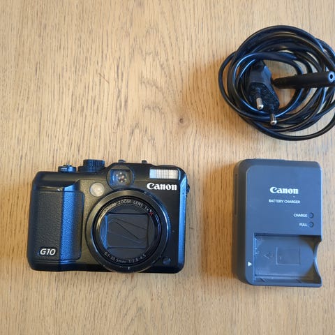 Canon PowerShot G1 X kompaktkamera i svart. Kameran har inbyggt Canon Zoom Lens 4x IS med brännvidd 15,1–60,4 mm och bländare f/2,8–5,8. På baksidan finns en vridbar LCD-skärm och flera knappar och reglage för manuell inställning. I bilderna syns även originalbatteri, batteriladdare från Canon samt nätkabel. Lämplig för allmän fotografering, resor och vardagsbruk där en kompakt kamera med zoomobjektiv önskas.