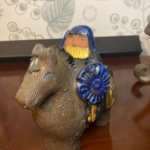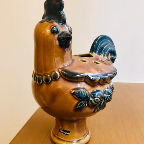 Meybod keramikfågel med handmålad dekor i flera färger. Fågeln är formad i glaserad keramik med mönster runt kropp och vingar. Undersidan är märkt Meybod. Passar som prydnadsföremål i hemmet eller som samlarobjekt inom keramik och hantverk.