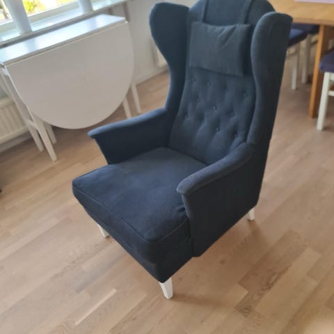 Barnfåtölj i fullt fungerande skick. Lite småfläckar på textilen och några skrapsår på benen.