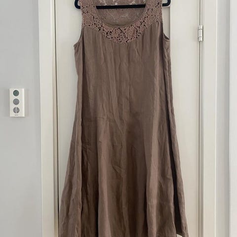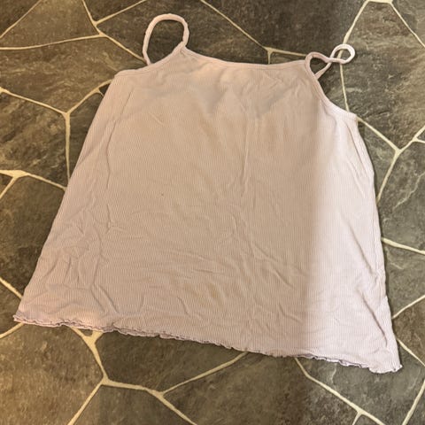 Linne topp för dam i storlek 38. Modellen är ärmlös med smala axelband och flera volanger med spetsdetaljer. Färgen är ljusrosa. Passar till vardag eller fest beroende på hur den kombineras med övriga plagg.