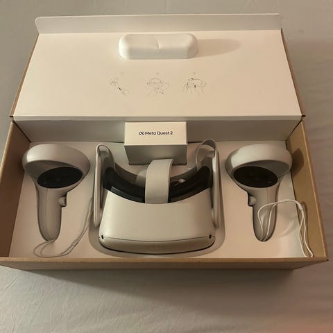 Oculus Quest 2 VR-headset med två trådlösa kontroller. Headsetet är vitt och har justerbara remmar för huvudpassform. Inga skador eller skavanker, allt funkar fint. Ca 3-4 år gammalt, men rätt lite använt. Finns i Enskededalen.