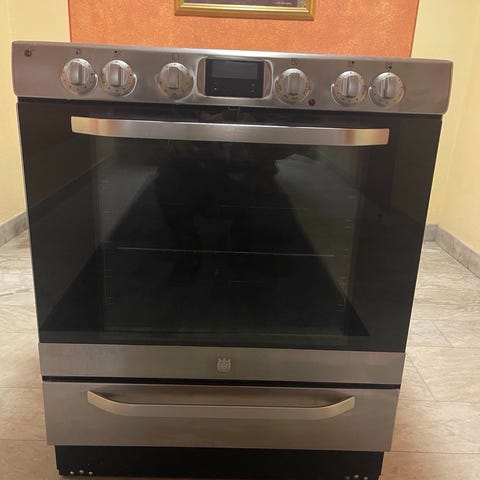 Electrolux glaskeramikspis med häll i svart glas och ugn med front i svart och vitt. Spisen har vredreglage på fronten för både häll och ugn. Ugnen är utrustad med galler och plåtar enligt bilderna. Under ugnen finns ett utdragbart förvaringsutrymme för plåtar och köksredskap. Fristående modell som placeras direkt på golvet och ansluts till el. Passar för normal matlagning och bakning i kök där glaskeramikhäll önskas.