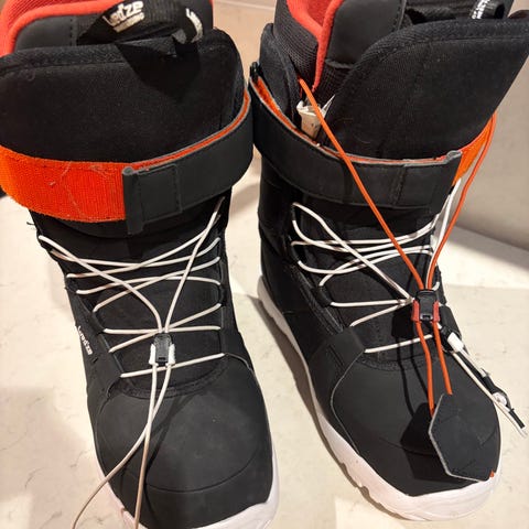 Burton Moto snowboardboots i svart med röd insida. Snabbsnörningssystem med draghandtag på fram- och ovansida. Grovmönstrad yttersula med rött Burton-emblem för bra grepp. Mjukt vadderad insida för komfort och stöd runt fot och ankel. Passar för snowboardåkning i olika typer av backar. Storlek enligt märkning på etikett (se bild).