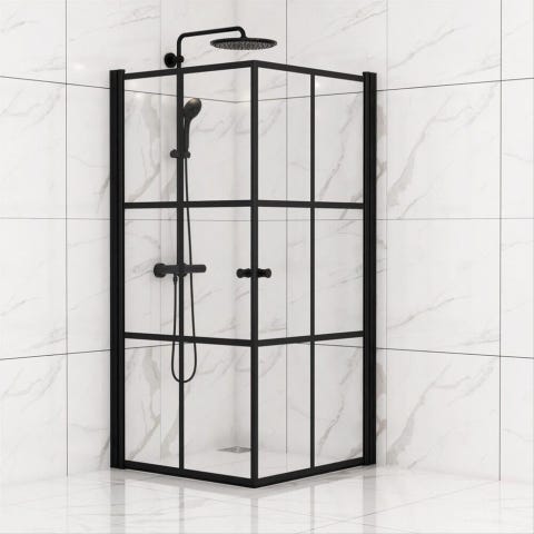 Duschhörna med två raka, invikningsbara dörrar i 6 mm glas.