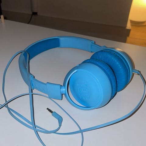 JBL hörlurar med sladd i vit färg. On-ear-modell med vadderade öronkuddar och justerbart huvudband. Ansluts via kabel med 3,5 mm kontakt. Huvudbandet och öronkuddarna är klädda i syntetmaterial. Extremt klart, skönt och bassigt ljud. Viss slitage kan förekomma på huvudbandets yta enligt bild men det här är inget som syns när du har på dig dom och går att laga. Dom är renade och det finns inga fler defekter än huvudbandet.