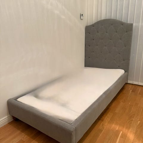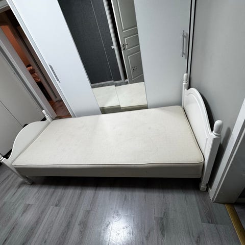 Englesson säng med vit huvud- och fotgavel i trä. Passar till resårmadrass 90x200 som enkelsäng i sovrum eller gästrum. Sängen har klassiska korsmönstrade gavlar. Passar både vuxna och ungdomar beroende på madrassval och bäddning.