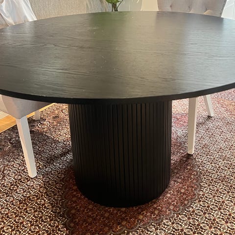 Matbord Plaine från Mio. Välanvänt och märken finns i skivan. Men stabilt och mycket kvar att ge. Båtformad skiva och svarta ben.
