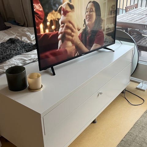 Denna TV-bänk med 8 lådor har två fungerande lådor. Den händige kan säkert fixa de som är ur funktion. På en låda till höger finns också en skada på framsidan,