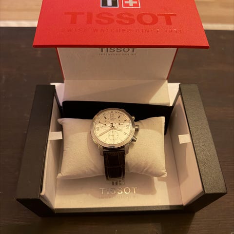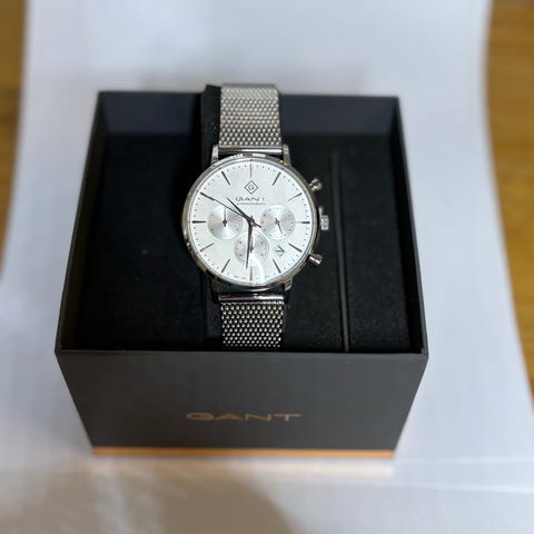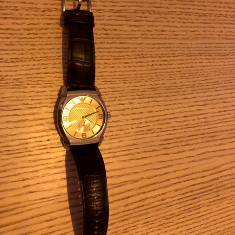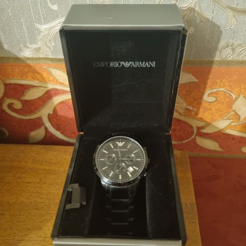 Armani klocka för kvinna i vit färg. Analog urtavla med kronografvisning och datumfönster. Boetten har metallfinish med ljus urtavla och tydliga markeringar. Armbandet är ljust och justerbart, extra länkar medföljer enligt bild. Levereras i originalask från Armani. Har typ inte används alls har nästintill inga repor.