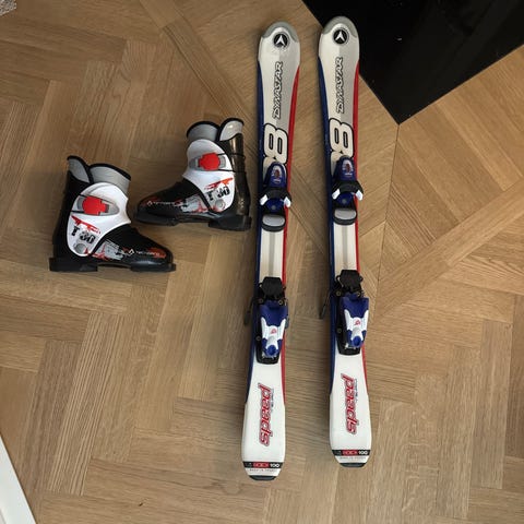 Atomic barnskidor med Salomon bindning. Skidorna är 90 långa. Ett par blå Firefly barnpjäxor med flera spännen och ett par svarta TecnoPro barnpjäxor med bakre spänne. Utrustningen är avsedd för alpin skidåkning för barn. Båda paren pjäxor är i storlek 210.