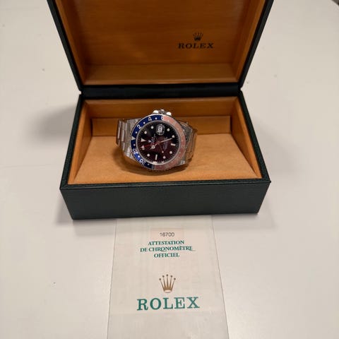Kommer fullsett . Vill byta så ren forsäljning är inte aktuellt . Endast mot Rolex i helguld allt i från gamla submariner day date osv