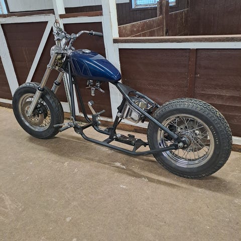 Ram från Calles chopperdelar. 3” stretch i ramen och gaffelben 22” över.