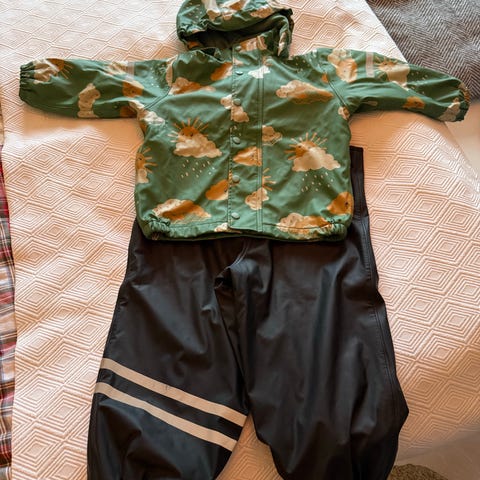 Fodrat regnställ storlek 80 i bra men använt skick. Finns en reva på ena byxbenet men som förmodligen går att laga. Jacka i fint skick, även så regnhatt