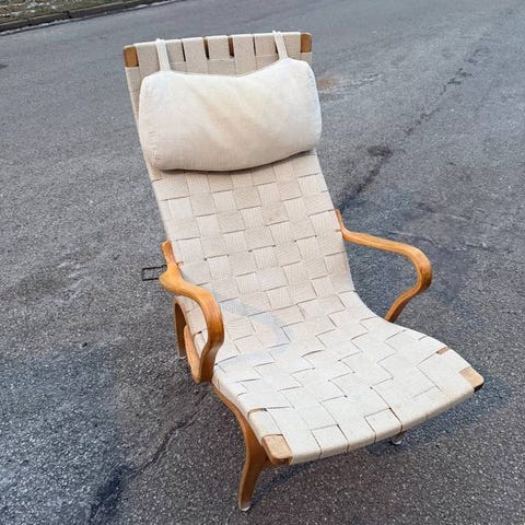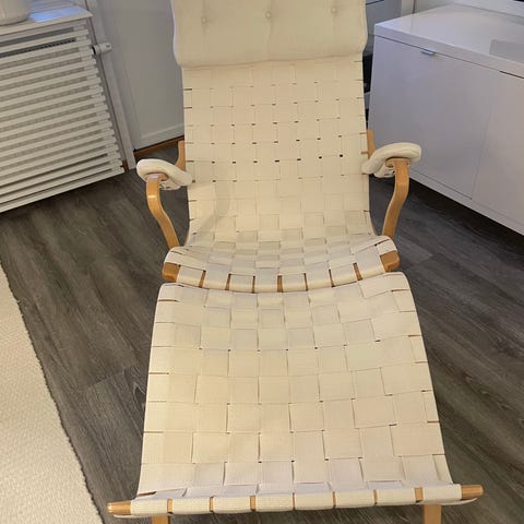 Fyra likadana designade fåtöljer i böjträ till salu med sits i snyggt vävtyg och armstöd i skinn. På bilden syns två av dem. Enkla att fälla ihop, stapla, förvara eller bära med sig. Finns i innerstan. 500 kr per fåtölj eller 1800 kr för alla.