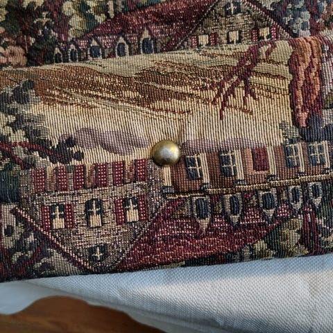 Väskan är tillverkad i mjukt, brunt kvalitetsläder och har ett vackert lock i vintage gobeläng med ett klassiskt naturmotiv (hjortar). Varje väska är unik och detta exemplar är i absolut toppenskick – inga märken, fläckar eller slitage.