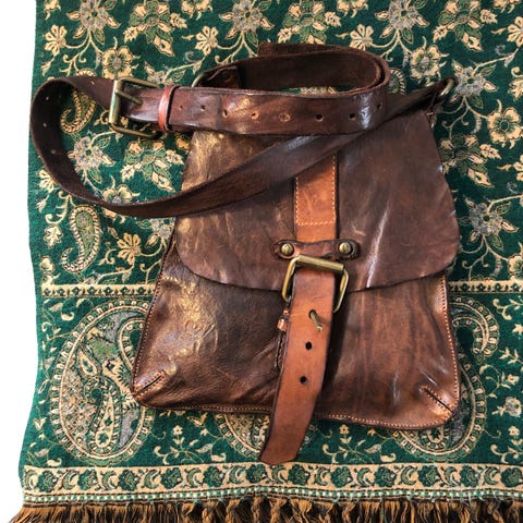 • Material: Återvunnet läder och vintage-tyg. Kraftigt innerfoder i brun canvas.