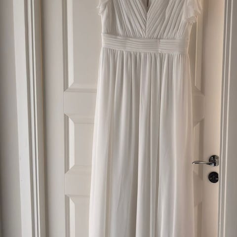 Bröllopsklänning storlek 38 men något liten i storlek. Den är kemtvättad och inplastad. Ingår brudslöja och klänningsgarderob för förvaring och transport (se sista bild). Använd två gånger men fortfarande i bra skick. Hämtas i Eslöv, kan skickas mot fraktkostnad.