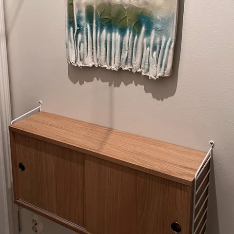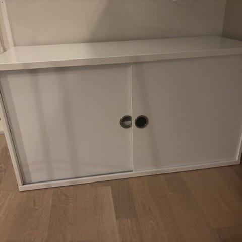 String skåp med skjutdörrar. Formgivet av Nils Strinning. Skåpet är avsett att användas tillsammans med Strings hyllsystem och ger dold förvaring bakom två skjutdörrar.