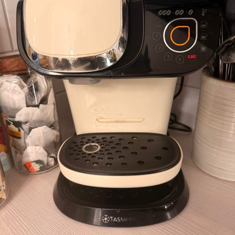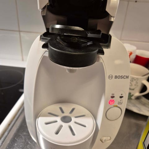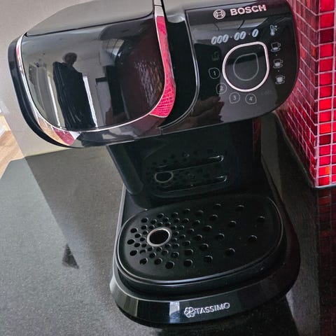 Bosch Tassimo kapselkaffemaskin i svart utförande. Maskinen använder Tassimo-kapslar för att brygga kaffe och andra varma drycker. Framsidan har knapp för start och stopp samt indikatorlampor. Droppgaller finns under koppområdet för att samla upp spill. Passar för användning i kök eller kontor där man vill brygga enstaka koppar kaffe med kapselsystem.
