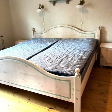 Säng, två sängbord och madrasser.