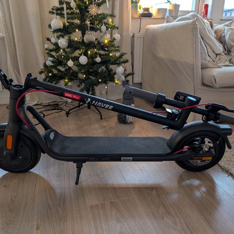 Navee elscooter i svart färg. Modellen har ståplatta, fram och bakhjul anpassade för stadskörning samt hopfällbar styrstam för enklare förvaring och transport. Utrustad med handtag, bromsreglage och fäste vid styret. Passar som persontransportmedel för kortare sträckor i urbana miljöer.