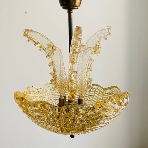 Taklampa med kupa av rödmelerat vågigt glas, lampfäste av mässing.
