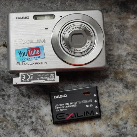 En digital kompaktkamera från Casio, modell EX-ZS10 med 5x zoom lins. Flärpen till laddningsuttaget har fallit bort, se bild, men utöver det i fint skick. 16GB minneskort följer med, samt laddsladd och originalkartongen med manual.