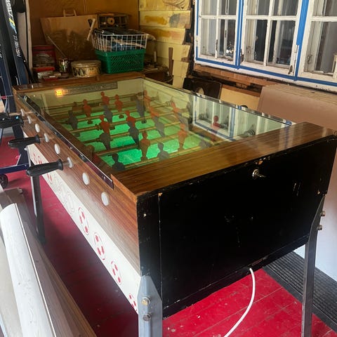 Ett mycket välbevarat retro bordfotbollsspel i nära nyskick, komplett med originalkartong och instruktionshäfte.