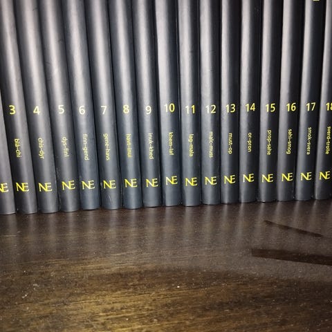 Uppslagsverk i flerbandsserie. Böckerna står samlade i en bokhylla och utgör ett komplett eller delvis komplett uppslagsverk. Inlagan består av text med uppslagsord, tabeller och illustrationer. Passar som referenslitteratur eller som dekorativ bokrad i bokhylla. Exakta titeluppgifter, språk, antal band och utgivningsår ges vid förfrågan.