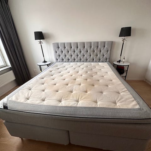 Mio säng med huvudgavel i grått tyg. Sängen har en vadderad och knappstoppad huvudgavel som ger stöd vid sittande.