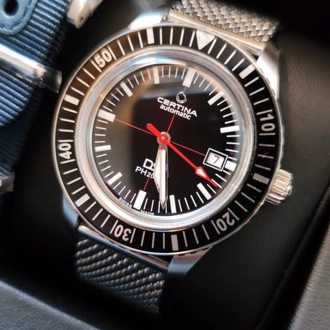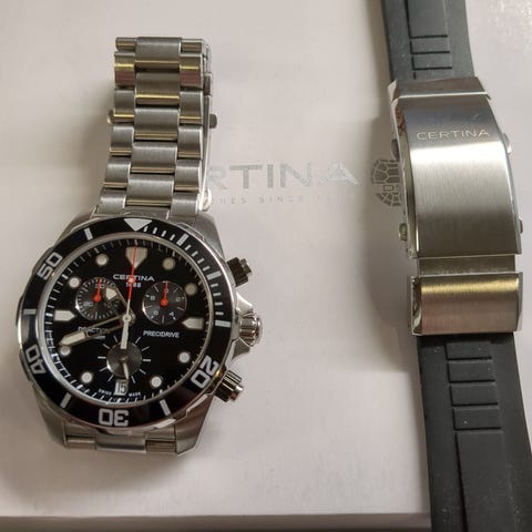 Säljer en Certina DS Podium Chronograph (quartz). Klassisk sportkronograf med safirglas, 100m vattentålighet, datum och tachymeter.