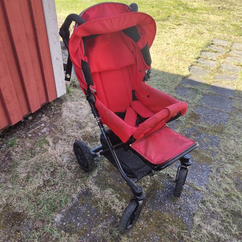 Jätte bra vagn .den har även såna smidiga bra handtag att lyftas upp till buss eller tåg .vagnen har några små fläckar .har inte försökt få bort .köptes till barnbarn men blev inte använd så säljes vidare .jättefina lufthjul .700 eller bud .finns i mockfjärd