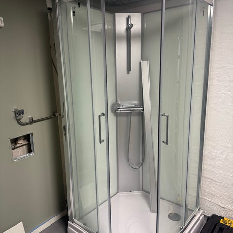 Duschblandare med handdusch i kromutförande. Blandaren monteras på vägg och har anslutningar för varm- och kallvatten. Handduschen är ansluten med flexibel metallslang. Passar för duschutrymme i badrum där en väggmonterad duschblandare önskas. Exakta mått och modellbeteckning är okända.