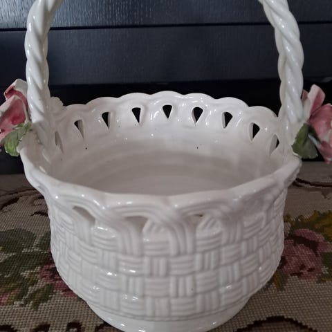 Dekorativ flätad skål i glaserad keramik från Bassano, Italien. Klassisk italiensk keramik med handgjort uttryck och vackra blomdekorationer på kanten. Passar utmärkt som fruktskål, serveringsskål eller prydnad.