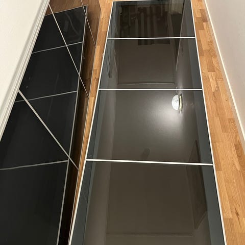 4 fina garderober med skjutdörrar från IKEA. Dörrarna är i glas och aluminium. Total bredd för alla 4 är 3m