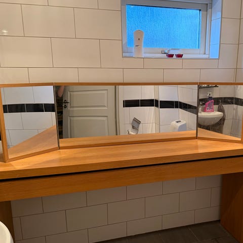 Vit skrivbordsliknande smink- eller arbetsplats med rektangulär bordsskiva och två utdragslådor framtill. Till bordet hör en större rektangulär spegel med inbyggd belysning i form av lampor längs sidorna. Underredet är i enkel, rak modell med ben och stag. Passar som sminkbord eller arbetsbord i sovrum eller vardagsrum. Färg: vit.inklusive en brun pall. Priset går att förhandla vid smnabb affär, finns lite defekt men visas på bilden,hoppas vi hörrs🌸💕🤗