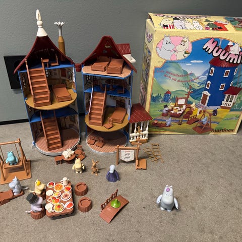 Martinex Mumin figurset med plastfigurer från Muminvärlden. Seten innehåller flera karaktärer, bland annat Mumin, Snusmumriken, Lilla My och ytterligare Muminfigurer. Levereras i originalförpackning med fönsterkartong. Tillverkaren anger att produkten inte är lämplig för barn under 3 år på grund av små delar. Märkt med CE-symbol och licensierad av Moomin Characters.